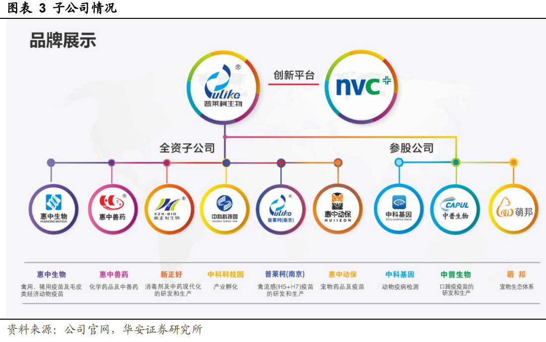 公司共有6家全资子公司和3家主要参股公司,分别从事猪用疫苗、禽用苗、宠物疫苗、兽用化学药以及中兽药的研发、生产和销售,现已拥有普莱柯生物、惠中生物、惠中兽药等多个品牌企业,拥有国家兽用药品工程技术研究中心,先后承担国家863项目、国家科技支撑计划项目等。