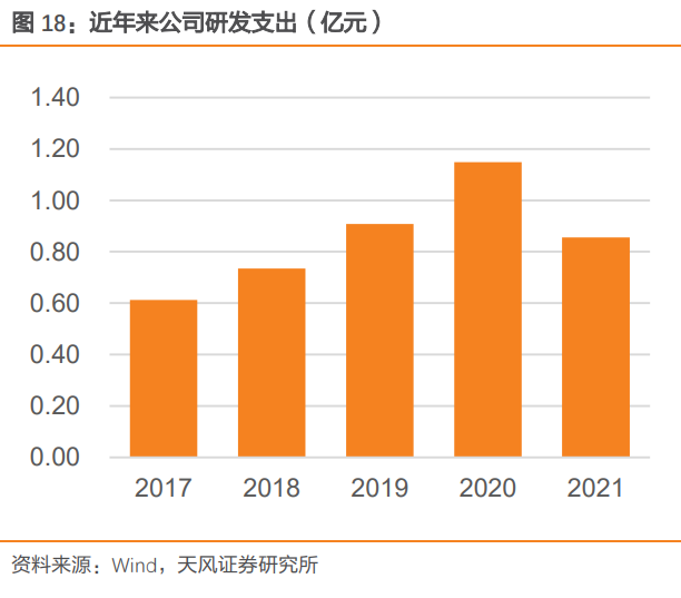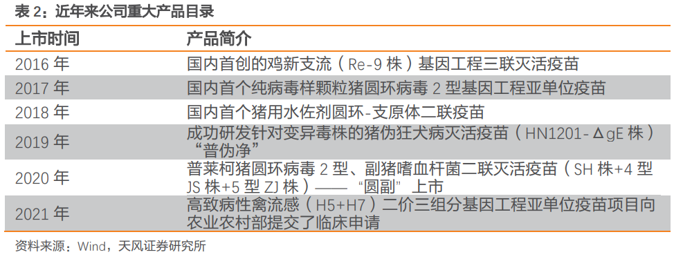 公司始终将自主创新和联合研发作为企业发展的源动力,拥有国家兽用药品工程技术研究中心、国家级企业技术中心、动物传染病诊断试剂与疫苗开发国家地方联合工程实验室三个国家级研发平台,在研发投入方面2017-2020年四年公司研发支出占营收比重分别为11.55%、12.08%、13.69%、12.37%。
