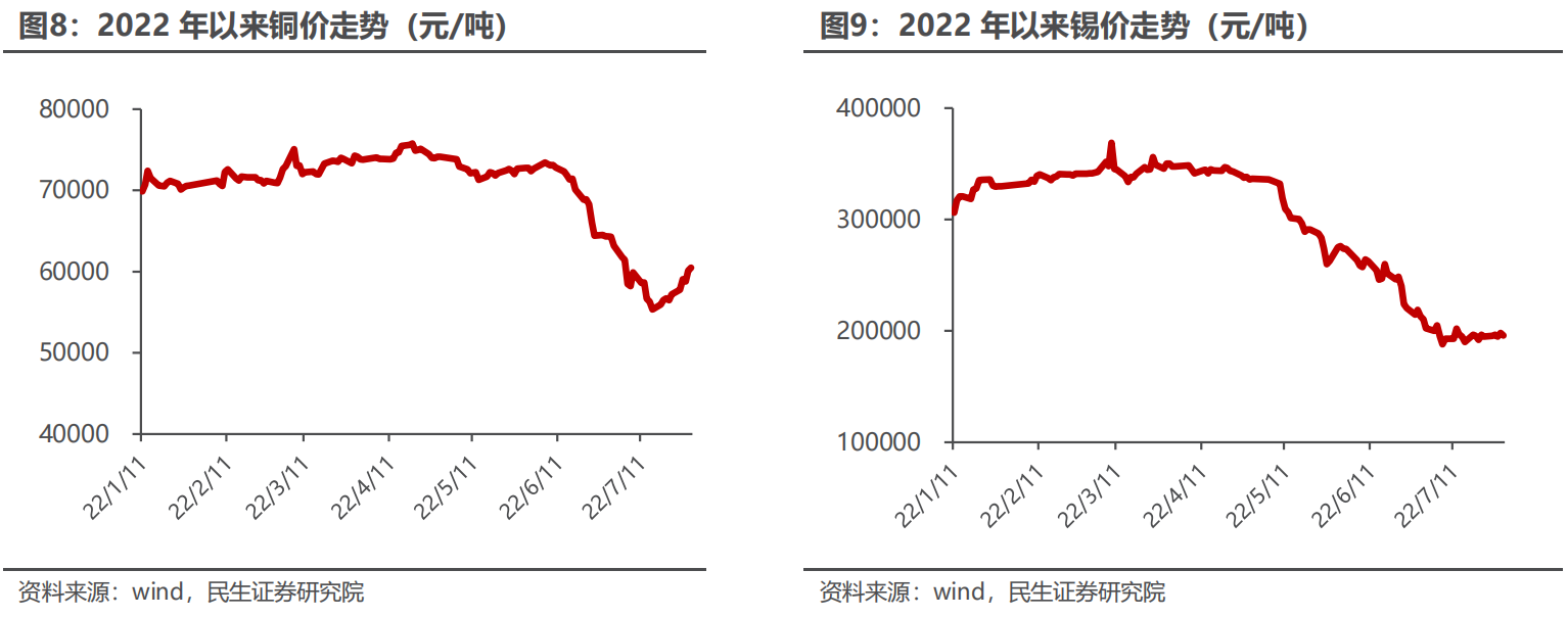 锡价方面,2022年初锡供应恢复的预期以及国内疫情管控和高锡价会对锡锭消费带来负面影响,5月进口窗口打开,锡现货市场再次受到冲击不断走低,同时各国央行释放加息预期,海外流动性收紧,价格继续走低。铜、锡价格的下降大幅减轻了光伏焊带成本压力,行业毛利率水平及盈利情况有望进一步提升。