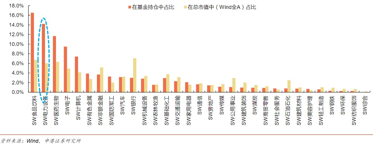 各行业在基金持仓中占比VS在总市值中占比