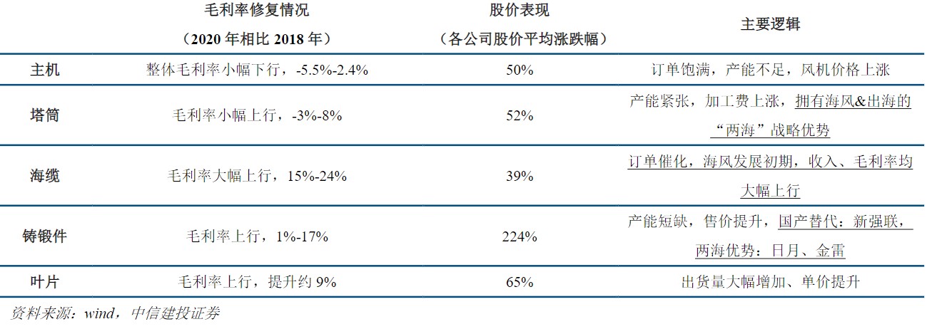 通过对2020年抢装期风电板块走势的复盘:海缆、铸锻件、叶片环节毛利率提升显著;铸锻件环节股价涨幅明显;具有国产替代和两海逻辑的环节、公司股价表现更加强势。