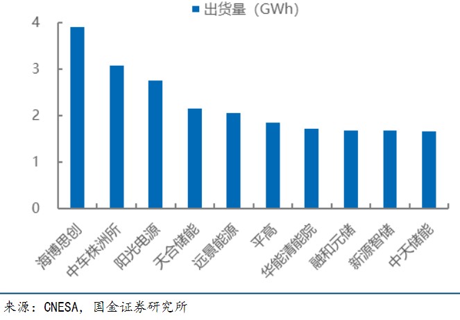 国内储能系统出货量排名前十位的储能系统集成商为海博思创、中株洲所、阳光电源、天合储能、远景能源、平高、华能清能院、融和元储、新源智储和中天储能。