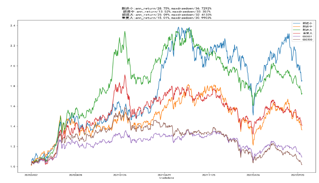 策略在模拟阶段内的收益(不代表未来收益):2020年4月至2022年10月,新进小组合净值超过1.8,重复大组合净值1.4,上证指数和沪深3000指数涨幅都低于10%,策略超额收益显著。新进小组合弹性较大,高峰时净值接近2.4,最大回撤达36.7%。