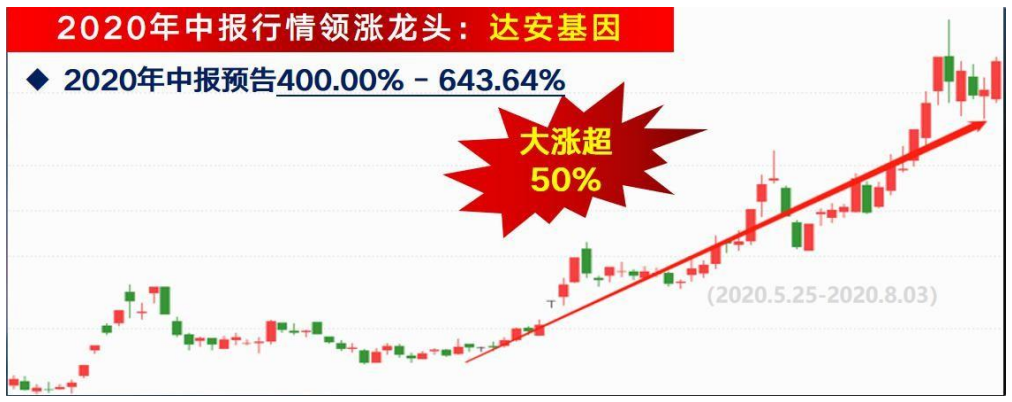 达安基因:2020年中报预告400.00%- 643.64%,随后股价大涨175%;