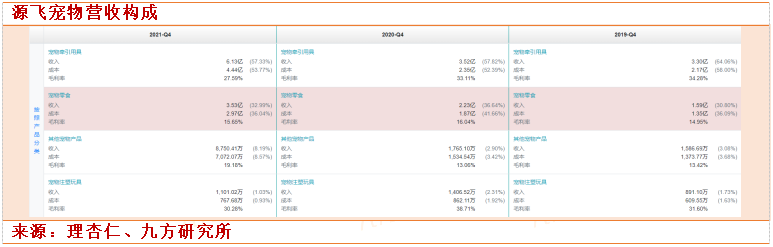 宠物牵引用具是源飞宠物第一大业务支柱,宠物零食紧随其后。2021年,宠物牵引用具营收为6.1亿元,占比达到57.6%;宠物零食营收为3.5亿元,份额占比为33.1%。2018-2021年宠物牵引用具/零食/注塑玩具的CAGR分别是37%/27%/14%。