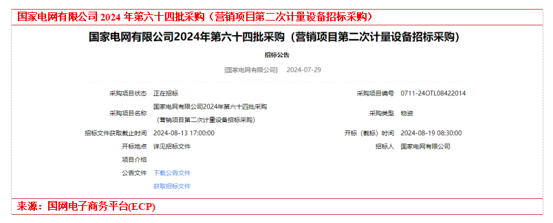 事件1:2024年7月29日,国家电网发布“国家电网有限公司2024年第六十四批采购(营销项目第二次计量设备招标采购)”招标公告,对各类智能电能表、集中器及采集器、专变采集终端进行招标。