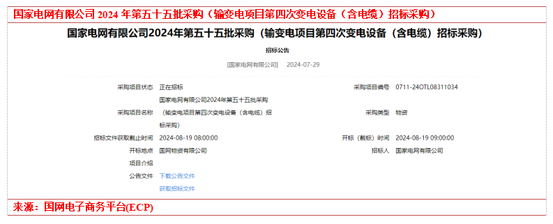 事件2:2024年7月29日,国家电网有限公司在其电子商务平台上发布“国家电网有限公司2024年第五十五批采购(输变电项目第四次变电设备(含电缆)招标采购)”招标公告。