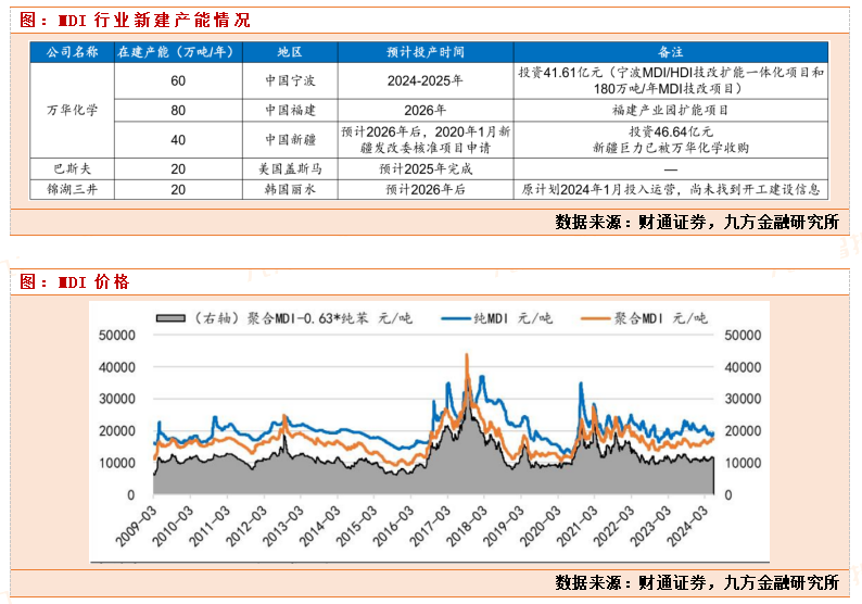 全球MDI产能在1050万吨左右,行业新增产能这块只有万华和巴斯夫新建产能比较确定,万华有近180万吨产能会在,25,16年逐步投产。相对于行业需求来说,行业新增产能这块还是压力加大。MDI价格景气度短期还是受到扩产的压制。目前纯MDI和聚合MDI价格18650元和17850/吨,周环比-100和+600元/吨。整体今年MDI价格聚合MDI价格表现较强,相对于23年价格整体中枢是下行的。MDI景气度还是受到国外和国内经济下行影响,需求端较差,但是随着美国9月份逐步开始降息,全球进入流动性宽松,同时国内经济政策的不断强刺激,国内经济也有望逐步得到改善。海外美国降息后,美国经济硬着陆风险降低,虽然美国8月份经济数据表现较差,但是也是有预期的,随着9月份降息开始,美国经济数据有望好转,美国MDI需求有望改善。拉长看。MDI产能这块25,26年万华有新产能投放,这块会压制MDI涨价高度,我们认为今年下半年MDI价格这块,聚合MDI价格还有望继续涨价,但是高端不会太高。在不考虑行业不可抗力的情况下,MDI大的景气周期应该在26年左右,随着万华的投产结束,行业新增产能较少,需求端稳步增长,MDI价格会逐步抬升。