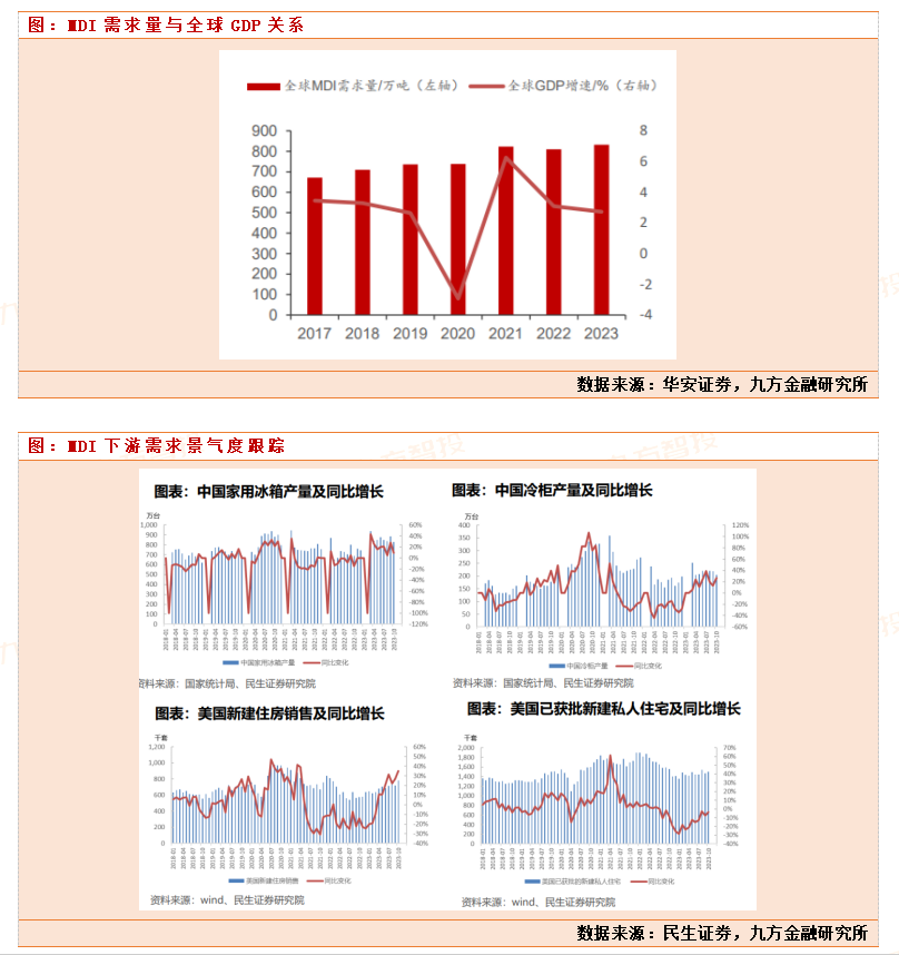 MDI 是作为最重要的化工原材料之一,常用于制造聚氨酯材料, 市场景气度和国民经济走势息息相关,目前主流的 MDI 下游主要用于家电、地产、纺服、弹性体等领域,具有周期属性的特点。从 2022 年起, 全球经济增速放缓,MDI 需求短期承压,价格整体处于底部区间。MDI 需求受国民经济影响,与 GDP 呈正相关,2023 年全球 MDI 需求量为 832 万吨。过去十年间,全球经济保持在 3%左右的增速,2020 年受疫情影响,全球 GDP 增速为-2.93%,2021 年重回正轨,GDP 增速达到 6.26%。全球 MDI 需求变化趋势相似,2020 年以前全球 MDI 需求保持 5%左右增长,2020 年 MDI 需求基本持平, 2021 年全球经济复苏,MDI 需求量达到 823.5 万吨,同比增长 11.51%,MDI 需求也迎来爆发增长。2022 年,国内疫情反复以及全球进入经济低迷期,MDI 需求量出现下滑,2022 年全年 MDI 需求量 810 万吨,同比下滑 1.64%,2023 年,经济处于缓慢复苏过程,全球 MDI 需求量达到 832 万吨,同比增长 2.71%。