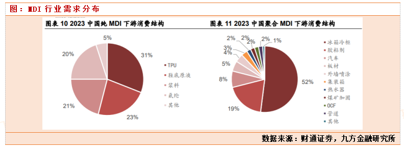 在MDI的生产过程中,会同时生成聚合MDI和纯MDI(比例约为2:1)。聚合MDI具有良好的隔热性能及高黏结性,主要应用于保温材料(冰箱冷柜、建筑保温)和胶粘剂等领域。纯MDI 具有良好的流动性和回弹性,主要应用于鞋底原液、PU 浆料、氨纶和TPU材料等。