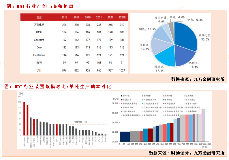 全球MDI产能高度集中,前5家产能占比高达91%,属于典型的寡头垄断型产品。其中万华化学是全球最大的MDI生产商。全球主要生产企业:万华、科思创、BASF、陶氏、亨斯曼,前五家市占率高达91% ,其中万华全球占比约30%,是目前行业的绝对龙头,公司MDI规模优势和技术优势明显,万华烟台和宁波产地,MDI装置可以做到100万吨,而行业平均才39万吨,远超行业平均,公司的规模优势太明显。单吨MDI成本全行业最低。万华化学国内产能占比约63%,随着万华多个MDI新建和扩产项目在未来2-3年内实施,其产能有望达到410万吨,并在2025年在国内产能份额达到70%,在全球产能份额达到35%。