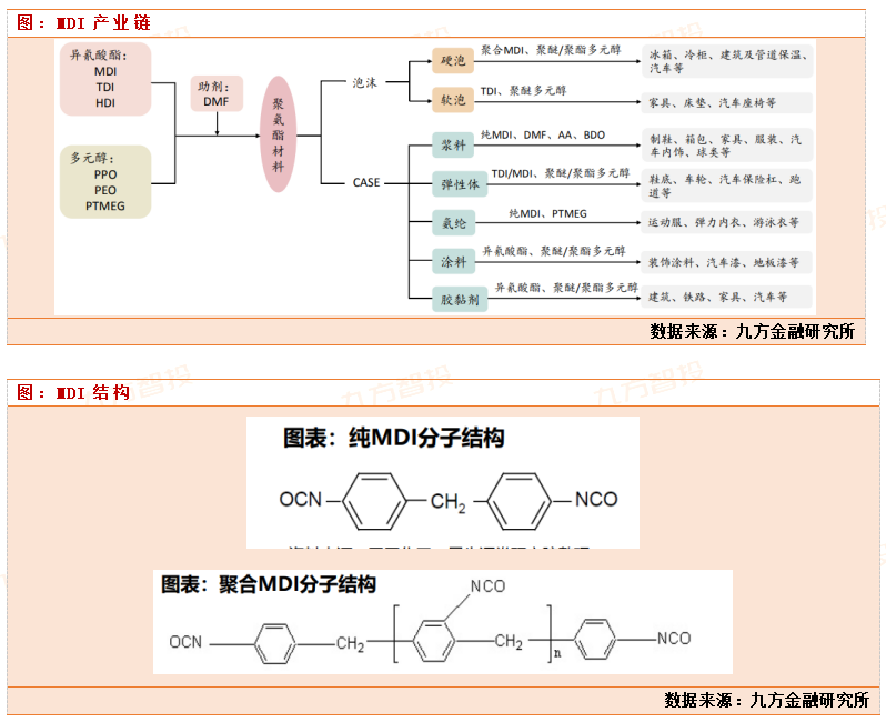 MDI (二苯甲烷二异氰酸酯),分为聚合 MDI 和纯 MDI,其中纯 MDI 是指含 4,4’-二苯基甲烷二异氰酸酯 99%以上的 MDI,室温下呈白色或微黄色固体状态,熔化为无色至微黄色液体,通常用于生产氨纶或弹性体预聚体。纯 MDI 在常温下容易生成二聚体而变黄,因此需要低温储藏,保质期仅为三个月左右。聚合 MDI(粗 MDI) 多亚甲基多苯基异氰酸酯,是不同官能度的多异氰酸酯混合物,组分中约有40-50%为二异氰酸酯,其余为三异氰酸酯和多异氰酸酯,常温下聚合 MDI 为深棕色或茶褐色液体,一般用于聚氨酯发泡。