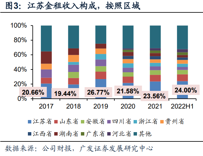 地域布局上,公司立足江苏省内优势向全国辐射,立足江苏省、巩固公司在省内的核心优势,并将业务积极向融资租赁需求较大的地区拓展,近年来江苏省租赁业务收入比例不断上升。