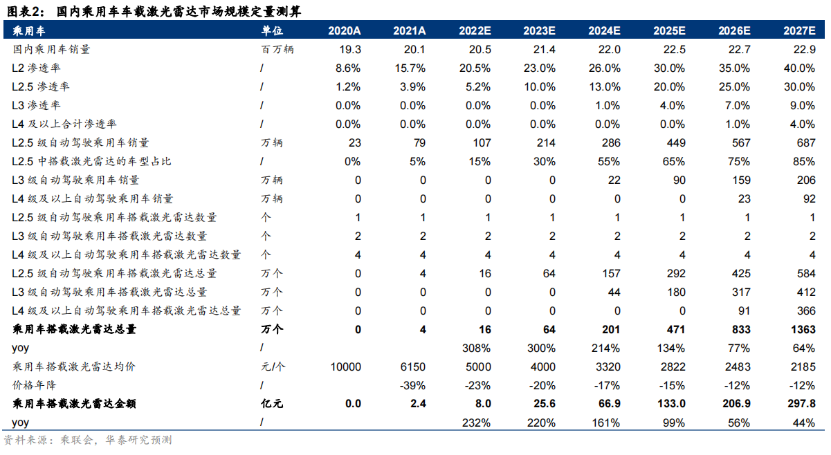 目前,我国激光雷达厂商受益于国内新能源车产业蓬勃发展,以及自身出色的量产交付能力成为全球市场主要参与者。2022年中国厂商ADAS激光雷达出货量占比合计预计已接近60%。据测算,2022年我国乘用车搭载的激光雷达出货量达到16万颗,到2023年预计出货量将达到64万颗,到2027年预计有望突破1300万颗,对应2023-2027年CAGR为143%。市场规模方面,国内乘用车载激光雷达出货金额有望由2022年的8亿元增长至2027年的298亿元,对应CAGR为106%。