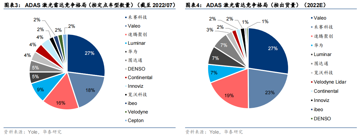 目前,蔚来、理想、小鹏等造车新势力厂商已推出搭载激光雷达的车型。比亚迪、极氪、集度、路特斯等有望在2023年发布搭载有激光雷达的新车型,为行业发展注入新动力。我国激光雷达产业链投资机遇空前。国产激光雷达厂中,以禾赛科技为代表的一些优质龙头企业快速崛起。按市场份额来看,禾赛科技已经超越法雷奥排名全球第一。