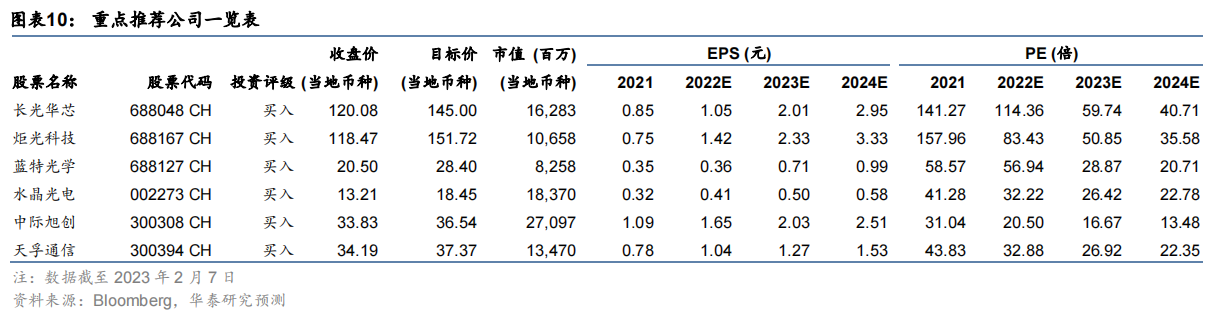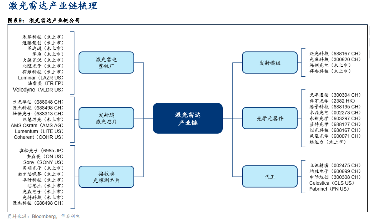 上市公司投资机会方面,机构建议可以重点关注长光华芯、炬光科技、蓝特光学、水晶光电、中际旭创、天孚通信等激光雷达产业中的优质企业。