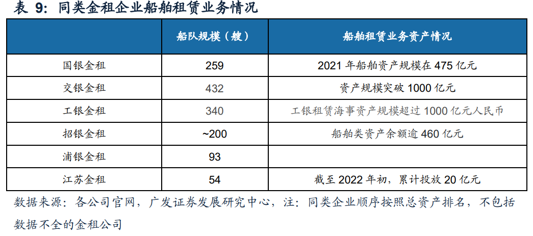 公司切入优势行业,布局船舶租赁,2020年底国内落地首单跨境SPV船舶租赁业务后,2021年公司全面进军航运国际市场,在天津、上海自贸区通过新设立的SPV开展了20笔船舶租赁业务,投放金额超13亿元。截至2022年初江苏金租船队规模已达54艘,总运力突破200万载重吨,涵盖散货船、集装箱船、成品油船、化学品船等 多种船型。相较于同类金租企业,船舶业务仍有较大的发展空间。