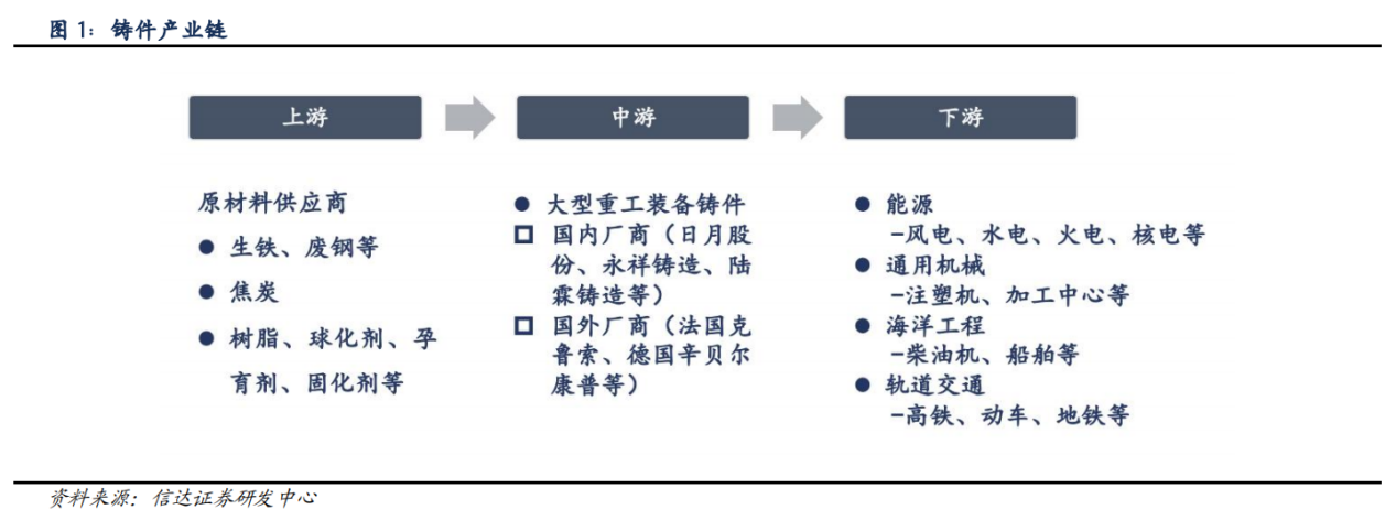 铸件是集材料研发、熔炼、浇注、热处理、机加工和检测为一体的高技术产品,是重工装备制造业的关键基础部件之一。铸件产业链的上游原材料主要是生铁和废钢。下游端,大型重工装备铸件广泛应用于重工装备制造的各个细分行业,是电力、通用机械、能源、机床、石化等下游行业的基础性行业。