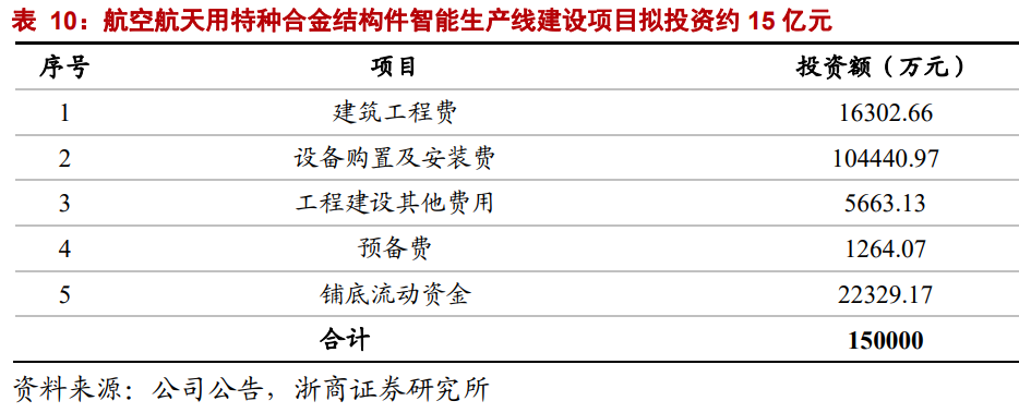 研报菌简评:航空航天用特种合金结构件智能生产线建设项目拟投资额约15亿元,设备购置及安装费约10亿,将用于购买大型模锻液压机、快锻压机、电动螺旋压力机等大型设备。
