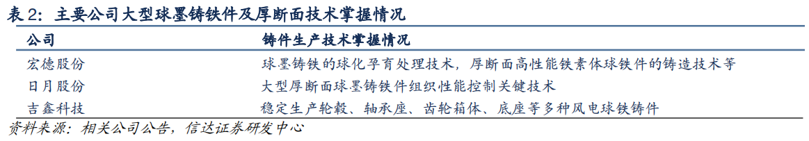 上市公司中,日月股份是国内最大的铸造生产企业之一,拥有年产40万吨铸件的铸造产能规模,主要产品包括风电铸件。公司以球墨铸铁技术为基础,不断攻克“厚大断面”技术,在风电行业致力于大型化产品的研发,长期持续为上海电气、金风科技等主要海上风机整机厂家批量供货。另外,宏德股份和吉鑫科技也掌握了大型球墨铸铁件及厚断面技术。