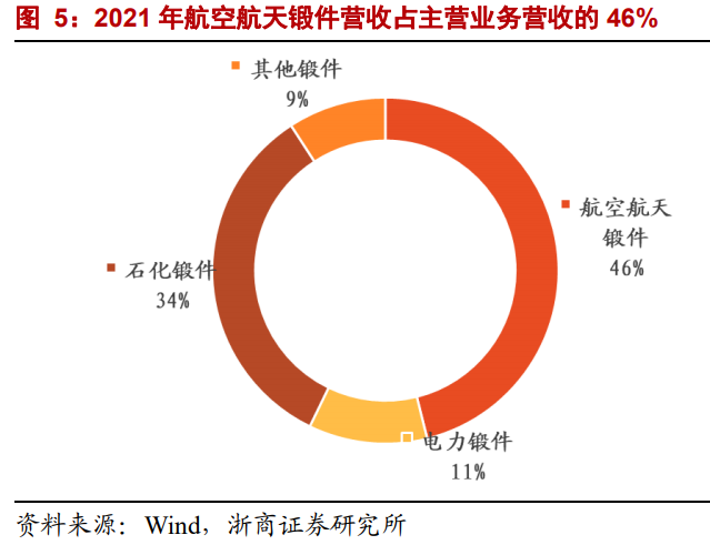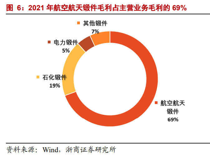 业务结构交付,“十四五”航空航天军品占比显著提升,公司持续深耕锻件产品,其中航空航天锻件营收占比从2017年的18%上升到2021年的46%,航空航天锻件毛利占比从2017年的28%上升到2021年的69%。