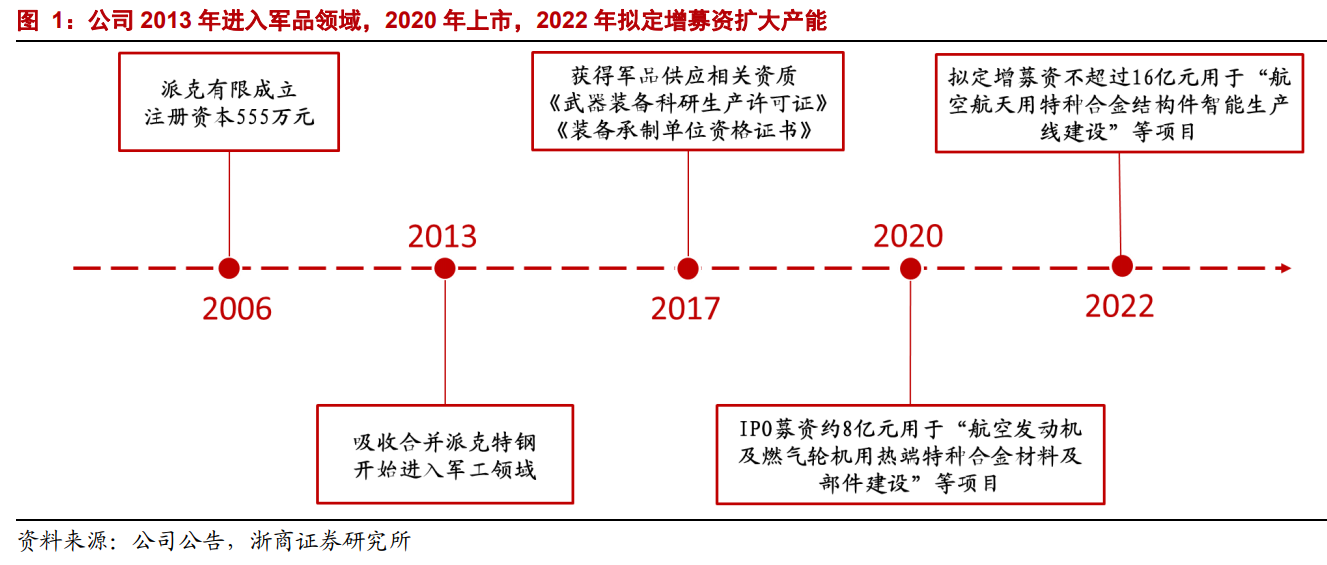 公司自成立以来主营业务未发生改变,为金属锻件的研发、生产和销售,2013年吸收并购派克特钢,同年开始进入军工领域,当前公司已成为国内少数几家可供应航空、航天、舰船等高端领域环形锻件的高新技术企业之一。