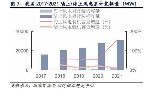 在下游应用中,汽车领域应用占比为28.9%,机床工具占比16.4%,内燃机及农机占比10.4%,工程机械应用占比9.4%,发电设备及电力需求占比4.8%。随着电力需求持续增长,可再生能源政策持续利好,风电产业装机量将保持持续增长。2017年-2021年海上风电新增装机量CAGR达70.87%。据据风电装机量不断提升的发展趋势来看,未来风电铸件市场需求规模也有望持续提升。