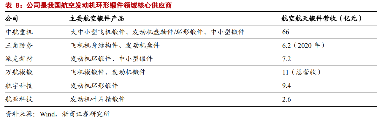 公司是航空发动机环形锻件领域核心供应商。我国从事锻造业务的大小企业很多,但能够从事航空高端锻造的企业则屈指可数。当前主要有大型军工央企下属单位、部分专业化民营企业两类,具体包括中航重机、三角防务、万航模锻、派克新材、航宇科技、航亚科技等。
