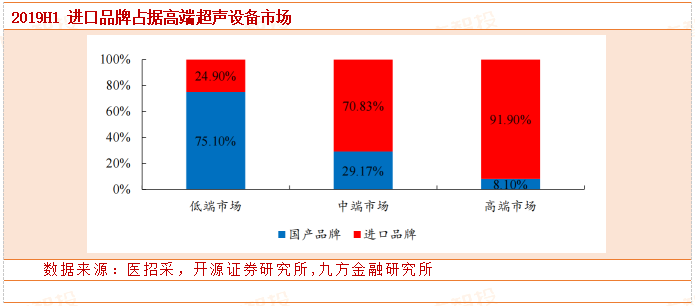 高端超声设备国产率较低,国产替代任重道远。根据医招采的数据,2019H1高端超声市场几乎被进口品牌垄断,国产化率低于10%;2017年至2019H1,中端超声市场国产化率由22.65%提升至29.17%,未来有望稳步提升;