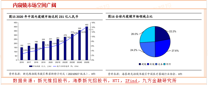 根据新光维招股书援引弗若斯特沙利文,中国内窥镜器械市场2016年市场规模152亿人民币,其中国产品牌渗透率仅为2.6%,于2020年达231亿人民币,其中国产品牌渗透率达5.6%。我们认为,在中国“2025制造”、进口替代等利好国家政策、国内企业技术水平不断提升的驱动下,内窥镜市场未来空间很大。