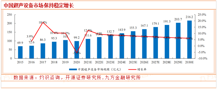 超声市场保持稳定增长。根据SignifyResearch预测数据,2019年全球超声销售额约为72.7亿美元,同比增长6%,销售量约为21.45万台,同比增长11.1%。灼识咨询的数据显示,2020年我国超声设备市场规模约为99.2亿元,预计2030年将增长至216.2亿元,2015年至2020年CAGR为7.3%,2020年至2030年预计CAGR为8.1%,我国超声设备市场已进入发展成熟期,增速较为稳定。