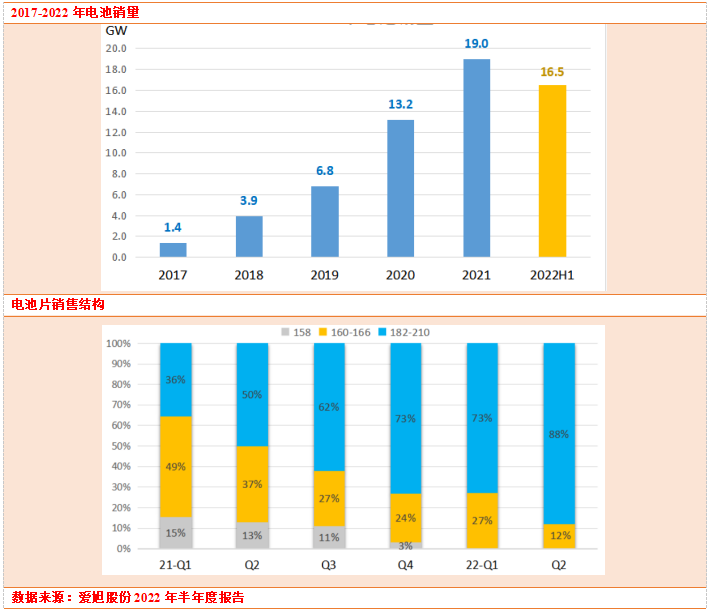 截至2022年6月末,公司已完成10GW166产能改造为182产能的升级工作,大尺寸产能占比达到95%以上,且大部分产能并可根据市场需求在182和210之间灵活切换。同时,主流电池产品的厚度已经从年初的160μm减薄为155μm,并在测试150μm厚度的量产实用性。