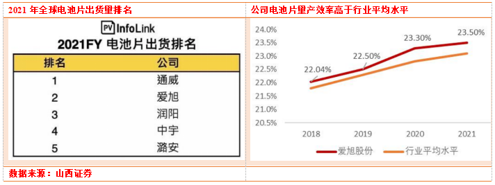 公司产品量产效率由2018年的22.04%提升到2020年的23.30%,明显优于行业平均水平,2018-2020公司连续3年实现电池片出货量全球第二。