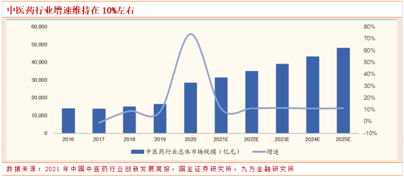 中医药行业受益于国家政策推动,行业规模稳步增长。根据《2021年中国中医药行业创新发展简报》显示,2022年我国中医药市场规模有望达到3.49万亿,2020-2025年间CAGR为11.21%。