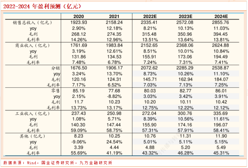 公司业务可分成商业和工业两大板块,其中商业板块可再细化成分销板块和零售板块。我们预计,公司2022/23/24年销售收入2335/2572/2856亿元,同比增长8.21%/10.13%/11.03%;平均毛利率13.51%/13.64%/13.81%。