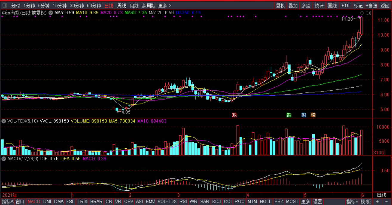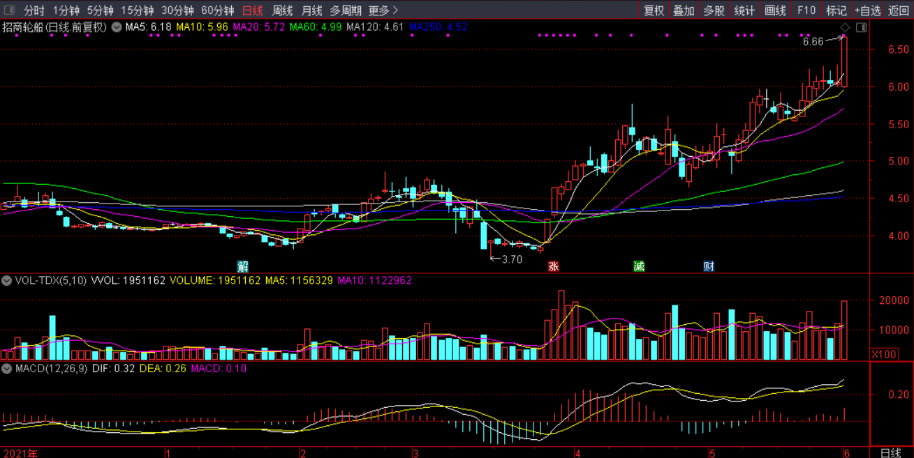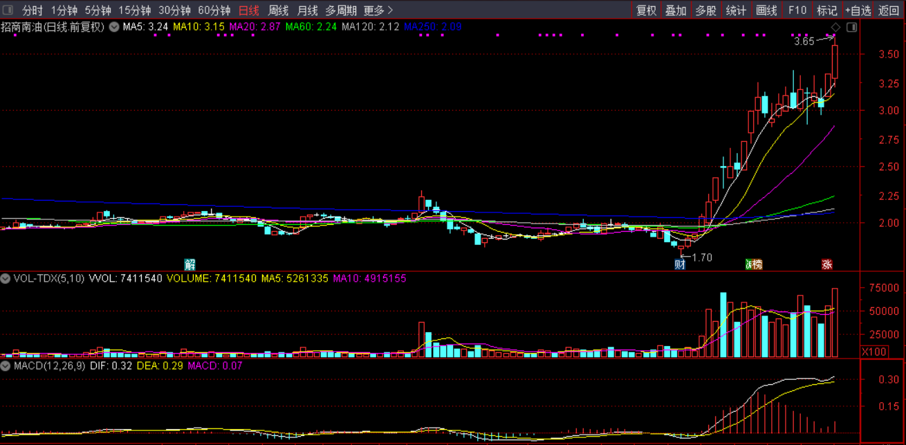 3)技术面看点:油运三剑客(招商轮船、中远海能、招商南油)均是单边趋势上扬,说明不是个例,而是整个行业趋势的反转。对于趋势股,一般贴着5日线操作比较好。
