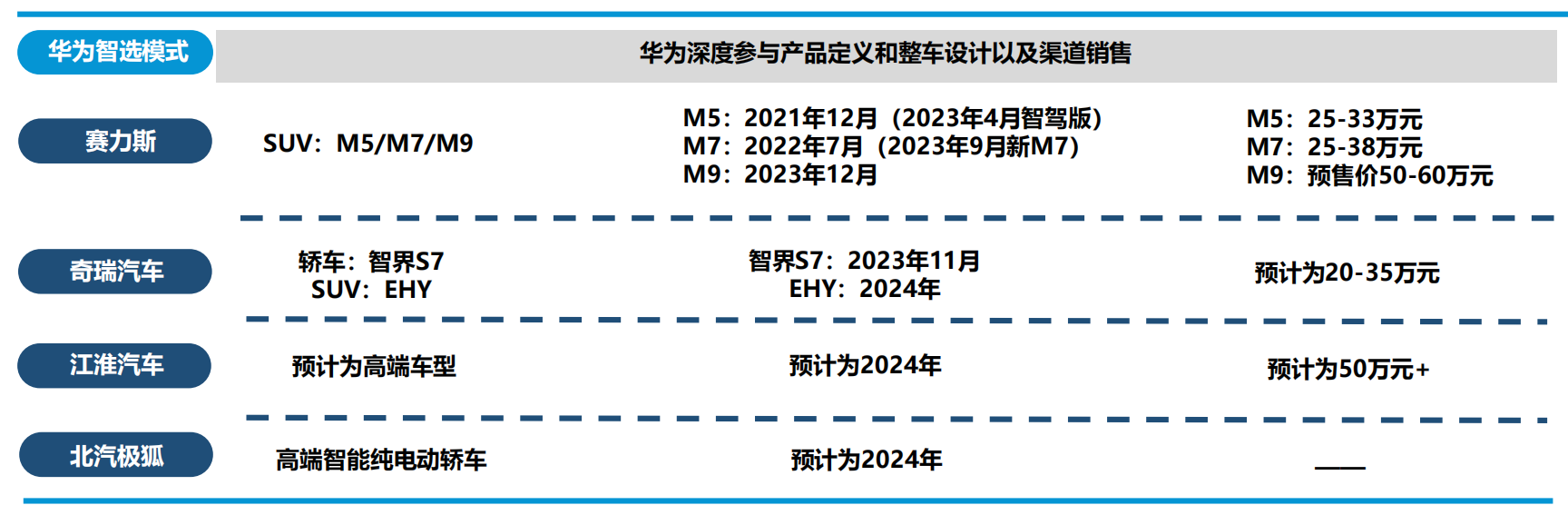 公司为华为智选模式下首家合作车企,与华为合作紧密。23年以来双方成立联合工作组,完成销售交付闭环管理;M5/M7完成换代,应用华为最新智驾技术;旗舰车型M9将采用全新平台开发生产,整车平台进一步迭代。渠道+产品多点催化下有望开启新一轮上量周期。