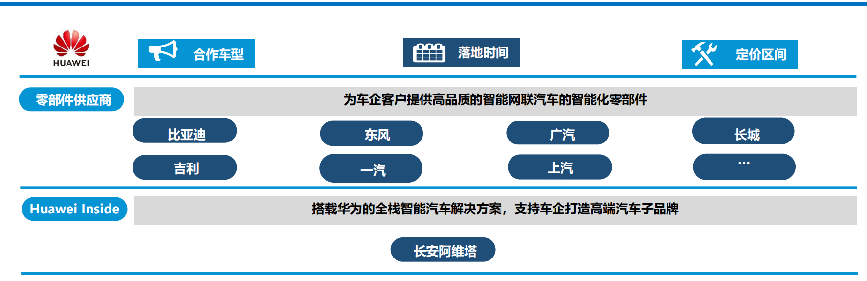 华为依托“鸿蒙+MDC+麒麟+盘古”组合拳(对应智能座舱系统、智能驾驶算力平台、车载芯片、自动驾驶大模型),实现了从核心芯片、自动驾驶平台到终端车辆运营的全产业链布局,具备唯一稀缺性。