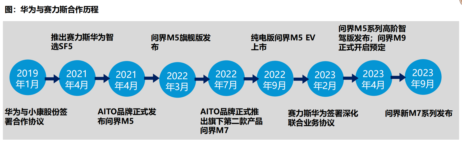 赛力斯是首个采用智选车型合作模式的车企,目前在售车型包括M5/M7。2023年2月赛力斯与华为签署深化合作协议,设立2026年实现新能源汽车产销达到100万辆联合业务目标。