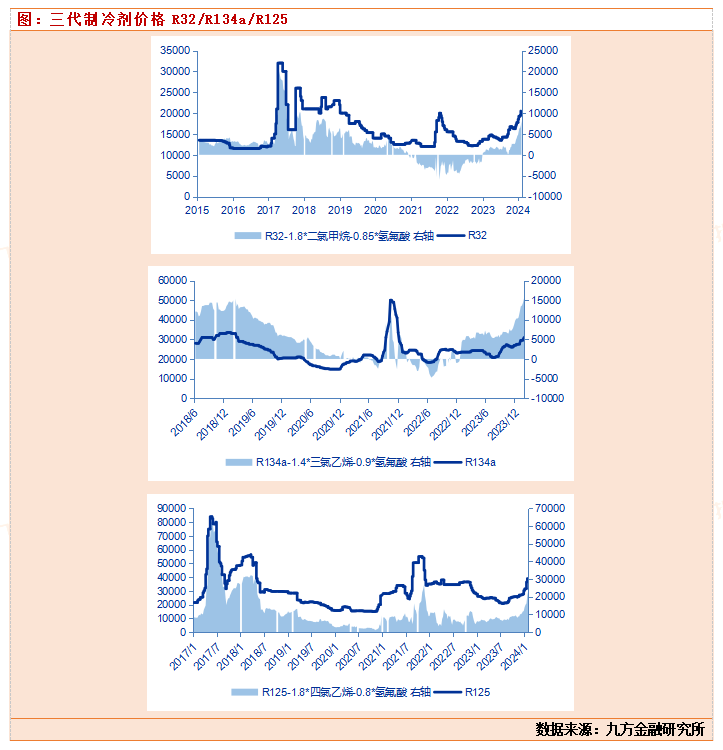 进入2024年,随着三代制冷剂配额分配的结束,同时一季度也是制冷剂需求景气度旺季,三代制冷剂价格也可以进入涨价周期中,景气度一度高涨!截止2月2日三代制冷剂R32价格已经到20500元/吨,相对于去年7月份13500元/吨价格,已经上涨51.8%。价格已经创了近4年以来的新高,其他品种比如R134a目前涨到31000元/吨,相较于去年低点20500元/吨,也上涨了49%,可以看出三代制冷剂价格从去年下半年景气触底后,价格一路上涨,到今年配额落地,涨价势头并没有结束。并且按照目前交流来看,目前三代制冷剂价格还没有结束,预期涨价高点要到3-4月份。
