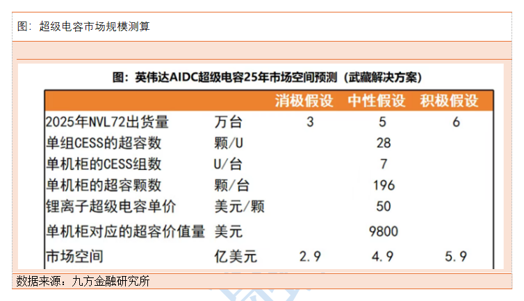 超级电容行业市场空间:目前来看GB200选配用量不大,随着英伟达GB300功率提升,超级电容将成为标配。目前2025年是超级电容元年,以武藏方案为例,LIC单价为50美元,单模组(1U)配备28颗,价格为1400美元,对应20kW的功率。一个NVL72机柜的功率为132kW,至少需要7U的超级电容模组,因此单台价值量为9800美元,5万台机柜出货量对应35亿的市场规模。未来随着超级电容标配,国内AIDC数据中心也开始大量装配超级电容,超级电容行业市场规模将成翻倍增长。预期到2030年,超级电容在AIDC行业市场规模将超200亿。
