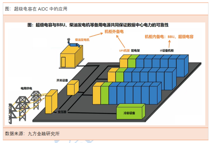 AIDC因为大功率,高性能等要求,普通电容无法很好的满足AIDC数据中心的需求。超级电容能满足AI产业发展带来的“削峰+备用电源”迫切需求。随着大模型参数与GPU计算能力提升,GPU的短时最大热功率(EDP)会大幅超过正常工作时的额定热功率(TDP),需要进行动态调和的电力尖峰变得更大,GPU自带的供电模块难以应对,将导致GPU性能削减20%-30%与数据中心基础设施、电力系统的故障问题。而超级电容作为能瞬时释放大功率的元器件,能有效补偿GPU的EDP-TDP的差值,在AIDC中发挥削峰填谷的作用。超级电容作为备用电源具备瞬时响应优势:供电中断会给AIDC带来数据丢失、文件损坏、设备损坏等一系列问题,而超级电容能在断电时做到瞬时响应并供电,是高功率、短时间备用电源的出色选择。