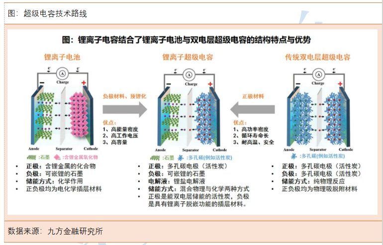 锂离子超级电容与传统双电层超级电容各具性能优势,均有应用于AIDC场景的潜能。传统双电层超级电容(EDLC):正负极都采用多孔碳电极(活性炭),利用其物质特性储存电荷,是纯物理作用,不涉及化学反应。相应的,EDLC具备循环寿命长、功率密度高、耐高温、安全性强等优势。锂离子超级电容(LIC)具备使用寿命、空间节约、能量密度的相对优势,已确定为英伟达链的AIDC超容路线。 传统双电层超级电容(EDLC)具备功率密度与响应速度的优势,同时在AIDC中发挥削峰功能需要元器件高频率地快速充放电,而锂离子电池的最高充放电次数约为2万次,因此只有3个月使用寿命,需要频繁更换、可靠性差。而锂离子超级电容的充放电次数可以接近百万次,使用寿命长达6年,可靠性更强。