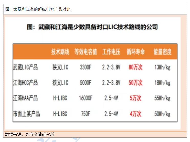 公司的解决方案在价格、技术参数具备比较优势:江海股份的方案中,用2颗LIC等效武藏的1颗(江海2颗的空间占用小于武藏的1颗),56颗为一模组,对应20kW,2颗LIC总价格约为40美金,较武藏产品(50美元/颗)降价20%。此外,不同于武藏LIC产品的方形,公司的产品采用卷绕形态,因而能量密度提高2-3倍,空间占用更少,生产周期缩短至少1/3。