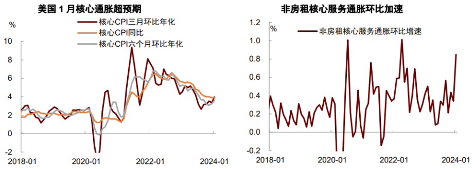 美国通胀数据超预期:1月份CPI与核心CPI双双超预期,给美联储降息押注带来沉重打击。尽管3.9%的核心CPI通胀与上个月持平,但0.4%的季调环比增速还是创下了2023年5月份以来最高,并且超出了美联储可以接受的范围。数据公布后,市场预期3月与5月降息不会降息。