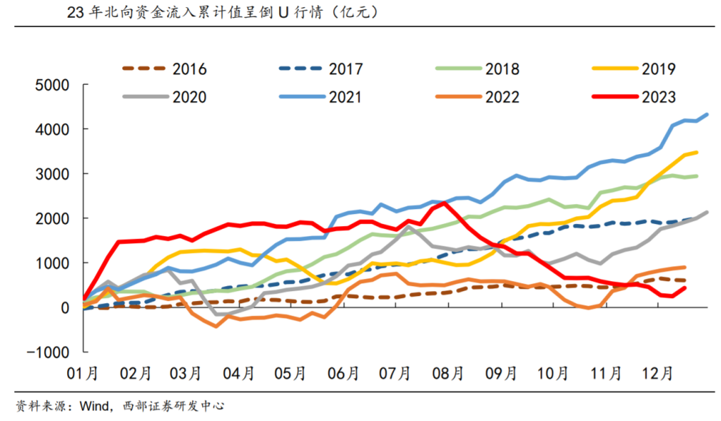 2023年内北向净流入处于历史低位,主要增持电新电子。23年外资流入累计值呈倒U行情,截至7月末北向资金净流入一度高达2300亿元,但后续5个月外资持续流出。全年北向资金净流入仅437亿元,创近8年最低水平。从行业口径来看,年内北向资金主要增持电力设备、电子和汽车,减持食品饮料、银行和商贸零售。