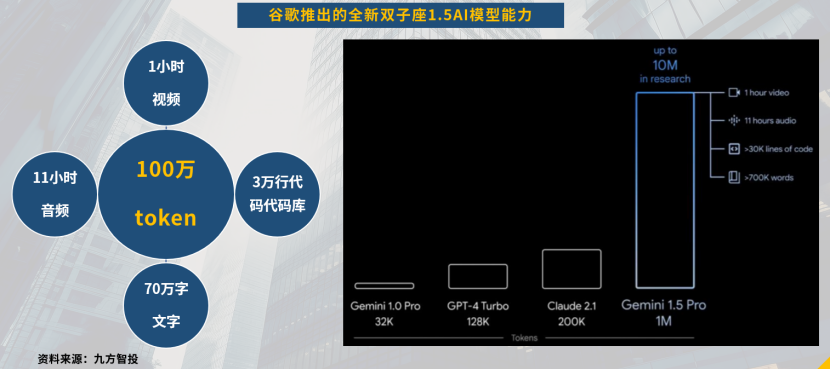 2月15日,谷歌推出全新双子座1.5AI模型代表新一代LLM,“使用更少计算实现与Ultra1.0相当水平”。该模型在长篇上下文理解方面取得突破,可处理100万token,是迄今为止基础大模型中最长上下文窗口。