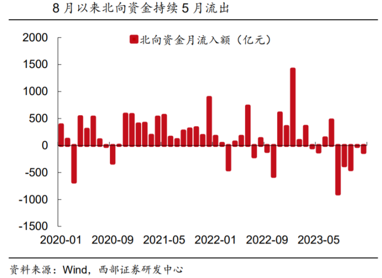 核心资产自去年9月以来,出现20%级别的回撤,主要是外资卖压。这一风险已释放的比较充分了。以2022年11月防疫政策调整为本轮外资流入起点,从2022年11月到2023年7月,北向外资合计流入了3254.44亿元。而从2023年8月到2023年12月15日,北向资金已流出2030.66亿元,占本轮净买入的比例超60%。