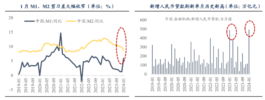 1月M1、M2剪刀差大幅收窄(单位:%),新增人民币贷款刷新单月历史新高(单位:万亿元)。历史牛市和M1-M2完全正相关,牛市都是从M1增速反超M2开始的。1月4.92万亿元新增人民币贷款,刷新2023年1月创下的单月历史新高;1月社融增量6.5万亿元,刷新了2022年1月创下的单月历史新高。M2-M1剪刀差为2.8%,较上月的8.4%大幅收窄。