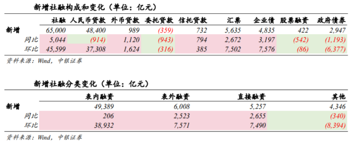 企业债及汇票贡献主要同比增量。1月社融各分项中,表内融资同比多增206亿元,表外融资同比多增2523亿元,直接融资同比多增2655亿元,整体开门红效应偏强,在去年高基数的基础上仍实现同比多增。1月社融口径人民币贷款新增48400亿元,同比少增914亿元,实现信贷开门红。